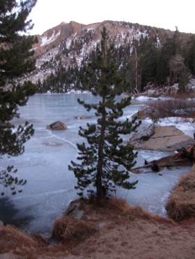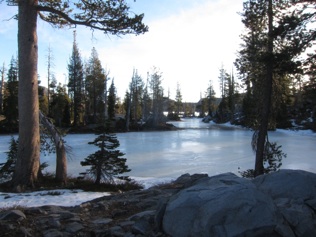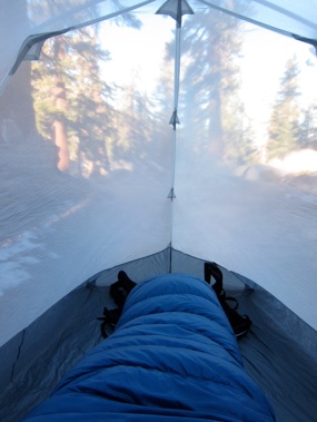 (above) last morning in the Kilo. Breakfast in bed is always a treat. (above right) Frozen lake, Desolation Wilderness. (right) Final ridge traverse and view of the Lake heading into Alpine Meadows.
