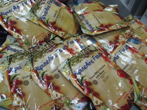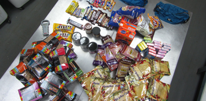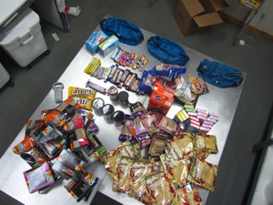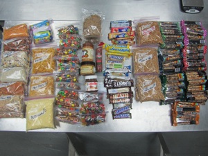 Before and After: Repackaging 76,000 calories into a manageable quantity. As much as practical, I try and eliminate packaging and reduce volume by crushing items like chips and crackers.