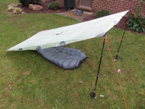 Modified Flat Tarp. One pole slightly lowered, for more protection.
