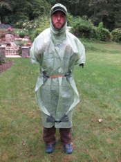 (above left) For maximum protection, I found it helpful to use a mini biner to cinch the front half of the poncho snuggly around my waist. It’s easy to pre-buckle the poncho and ‘step into it’ while putting the poncho on. (middle and right) Additional photos of full storm mode. I’m wearing a 30l pack underneath. With arms tucked in, you can see the amount of coverage and protection the poncho provides. Breathability begins to suffer in the configuration though.