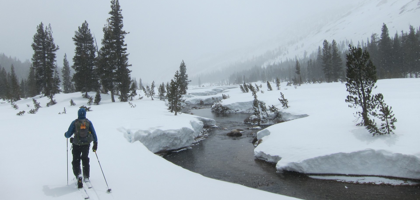 Trauma cutting tracks on the south side of Dorothy Lake Pass during our JMT shake down trip last spring. Conditions like these, albeit foggy and viewless, would be a godsend. Things will get very spicy upon the arrival of each winter storm.