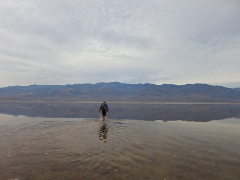 We began our trek in Badwater Basin on October 24th, just two weeks after a record-breaking rain storm deposited 3” of precipitation across Death Valley in just a few hours; 150% above their annual rainfall. In the wake of this flash flood, the former legendary salt flats of Badwater Basin were transformed into tranquil Lake Manly; a rarely seen body of water nearly 2ft in depth. Consequently the start of our route was ironically marked by the longest ford of my life, a three-mile gaunt of mud and muck across Badwater Basin. It was an eerie feeling standing there alone, gazing across this body of water, not entirely sure how deep this ford was going to get. This level of uncertainty would be a constant companion for the remaining miles.