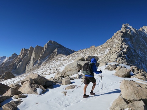 Nacho faces blustery conditions atop Russell Col, Whitney is the high point on the left.