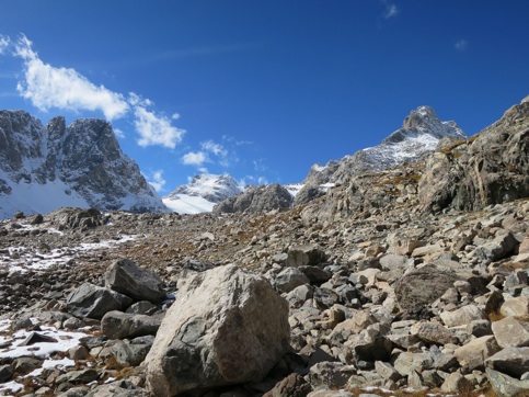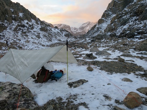 In knowing this route will traverse several large glacial fields and terrain up to Class 3/4, footwear became a careful consideration. I would need something comfortable enough for putting in long days, yet burly enough to stand up to miles of boulder hopping and talus traversing. The sole would need to have sufficient traction for moderate alpine climbing and be compatible with instep crampons. The combination I settled on what a pair of OBOZ Switchback mated to a set of Vargo Ti Pocket Cleats.