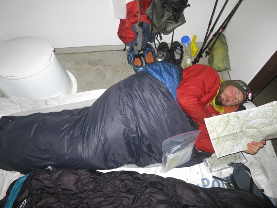 Throughout the entire trip we utilized the exact same shelter the entire time. The MLD Cuben Duomid’s was proven on our Great Himalaya Trek together in 2011 for performance and durability. The space to weight ratio is amazing and the strength of cuben fiber in windy condition is unmatched. A floorless tarp is preferred in the winter for the ability to dig into the snowpack to create more space and protection. A mid also utilizes equipment that you are already carrying, such as skis and ski poles, for set up. A simple sheet of tyvek was used as a groundsheet for added durability over polycro. Later in the trip I began using my MLD poncho tarp as a groundsheet, likely shortening it’s lifespan, but adding multi-function and saving weight.