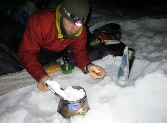 Alcohol stoves tend to get a bad wrap for winter use. Sure there are limitation, but the advantages should not be overlooked. I’ve used alcohol stoves on nearly every long distance trip I’ve been on. I love their simplicity and minimal weight. Shaving every extraneous ounce became priority, especially when we knew we would have a much heavier base weight with winter gear, ski gear AND longer resupplies than the summer. Our cooking style is very basic, with most meals only needing to boil water. Sure it did require extra time each night to melt snow and cook our meals, but time was nothing we were short on. We were routinely getting 11+hr of sleep each night and having both of our stoves going at the same time for up to 1.5hr greatly increased the warmth felt under the tarp.