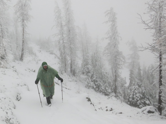 We very quickly realized there is nothing that will keep you 100% dry, day after day. At some point the levee will break. This is of particular importance when you are traveling at or below freezing temperatures on a daily basis. The key was to accept this reality and adjust our travel to suit. We minimized our snacks breaks and food types to be quick and easy to consume. We incorporated the layering philosophy into our foot and handwear through overboots and overmitts. The poncho took the bulk of the precip shedding duties while also adding a margin of safety in keeping the pack contents dry. Above all, changing into warm and dry clothing at the end of the day became our serenity. Everything else became a quarantine pile until morning. Synthetic insulation is a godsend in the winter!